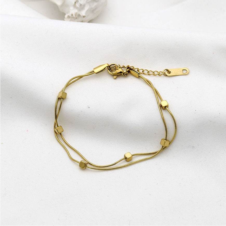Expertly crafted with alloy material, the Golden Orbit Bracelet features a small square geometric design that adds a touch of three-dimensional decoration. Its shiny finish and golden color make it a popular element in any outfit. Each bracelet is individually packed for your convenience. Upgrade your style with this sleek and modern accessory
